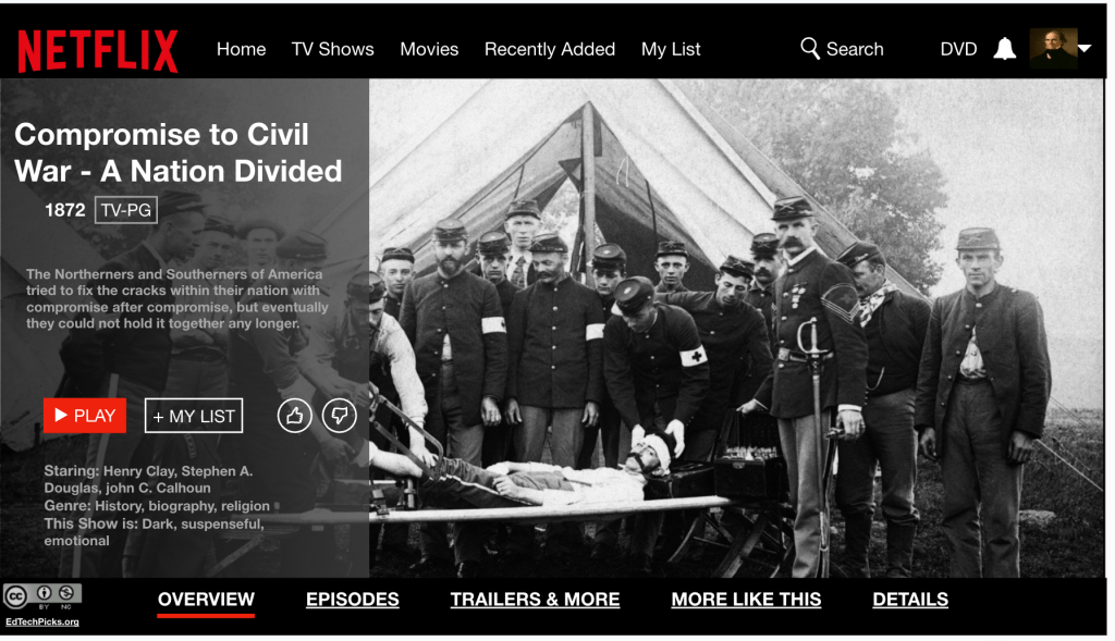 - A thumbnail image, cast list (Henry Clay as “The Great Compromiser”), and a content warning