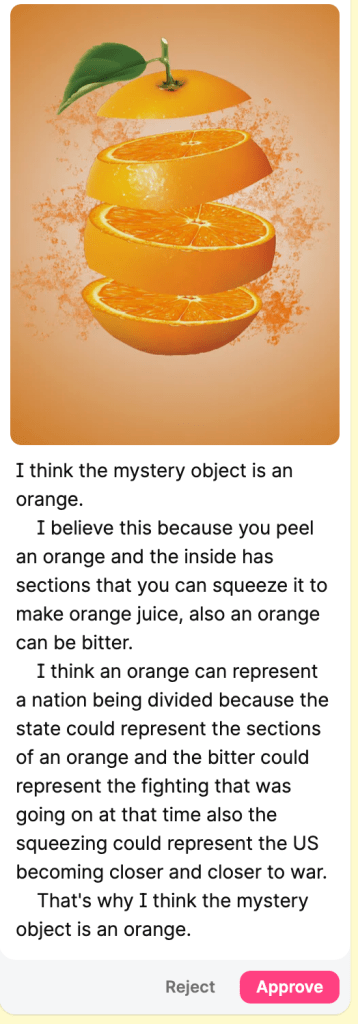 We were covering the Lincoln-Douglas debates—a pivotal moment tied to the expansion of slavery and the rise of the Republican Party. I pasted a section of our textbook into ChatGPT and gave it a twist: “Rewrite this reading. Keep all the key facts. But embed five subtle clues to an object: an orange. Don’t name it. Just hide it.”