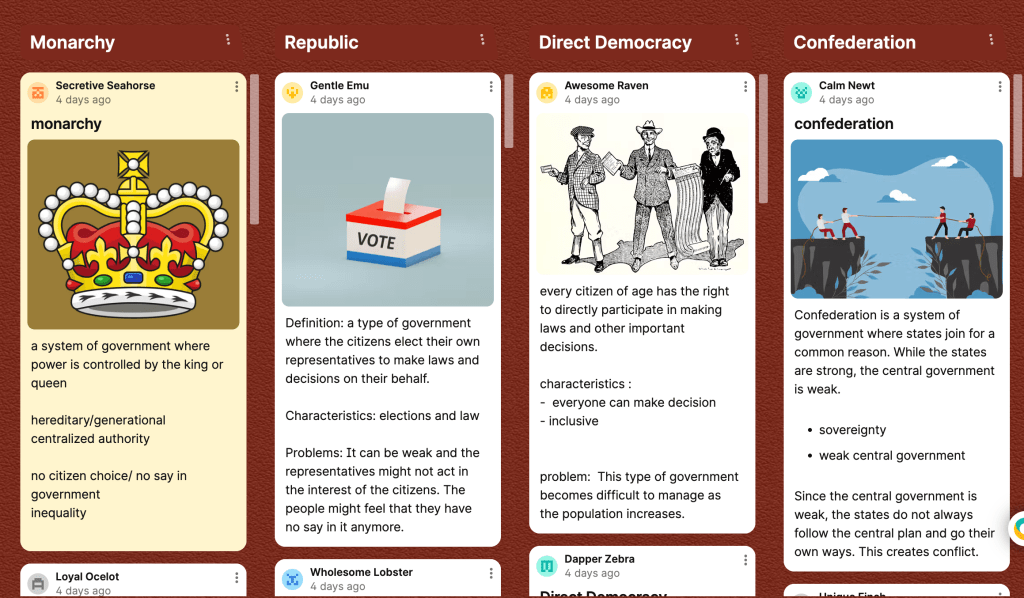 Next, I passed out half-slips of paper describing four systems: republic, confederation, monarchy, and direct democracy. Students contributed to a Padlet with the characteristics, limitations, and a picture for each system. This took about ten minutes.