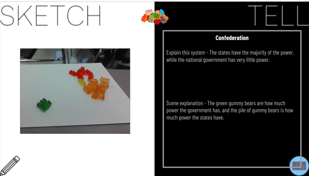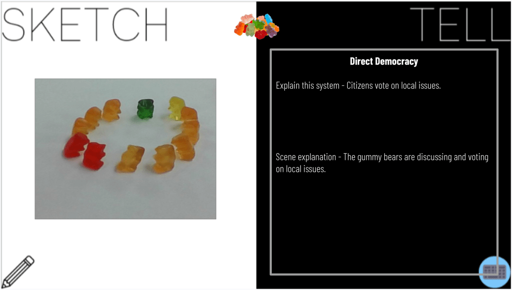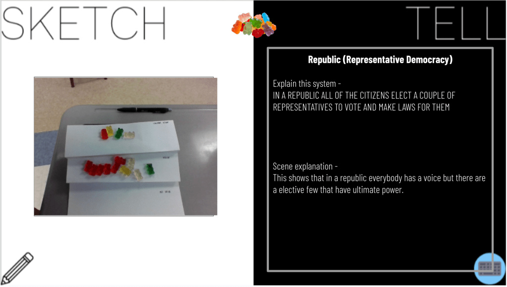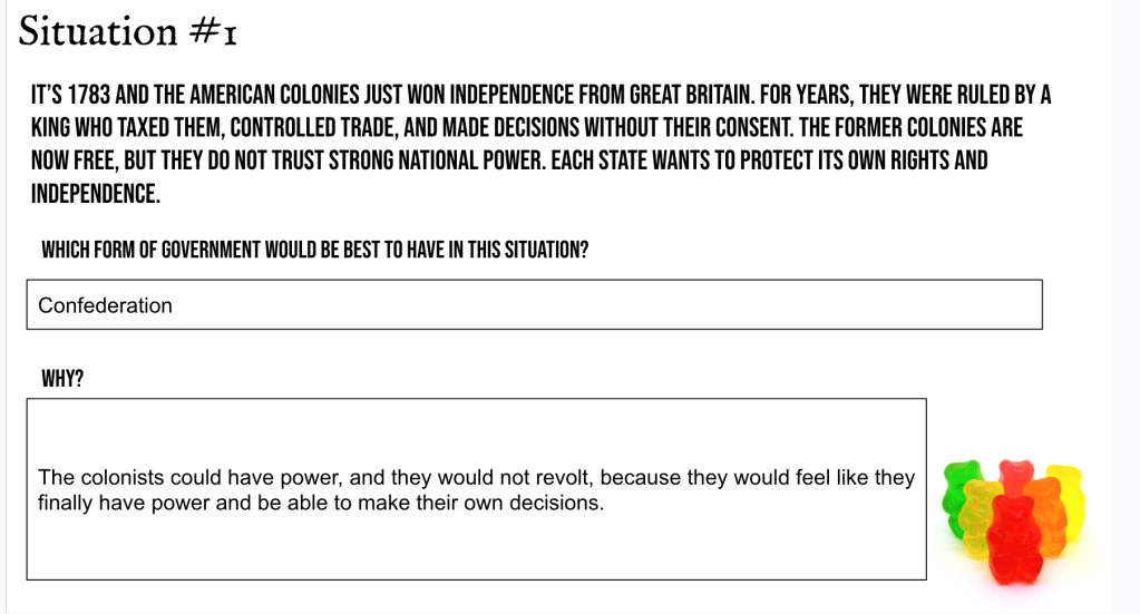 After that, I passed out gummy bears. Students created physical scenes showing the four systems of government from Monday: republic, direct democracy, monarchy, and confederation. The task was simple: define the system, build a scene that shows how it works, and explain it in writing. I encouraged them to look back at their Frayers from Monday for vocabulary and characteristics instead of just guessing.