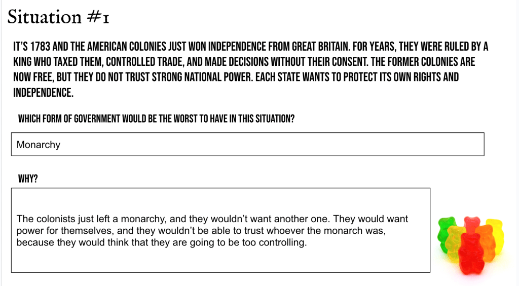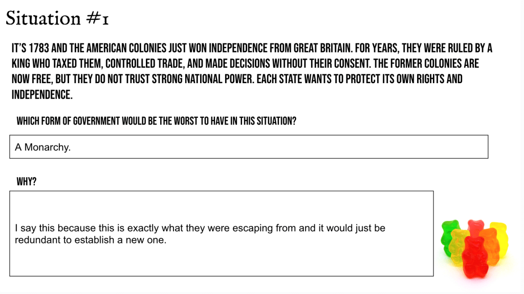 To close out the lesson, I gave students a historical scenario from 1783 and asked them to think. The colonies had just gained independence from Great Britain. They had been ruled by a king who taxed them, controlled trade, and made decisions without their consent. Now the states were free, but they did not trust strong national power. Each state wanted to protect its own rights and independence. Students had to answer two questions: which government system would be best in that situation and which would be the worst. They also had to explain why.
