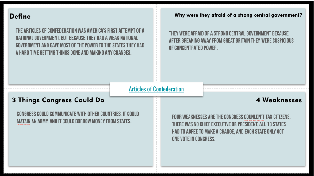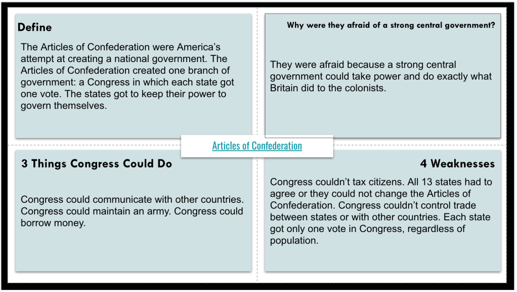 Last year I realized something about the Articles of Confederation: before I teach them, I actually need to teach systems of government. To me, the Articles are basic — weak national government, couldn’t do much, states held the power, blah blah. But a lot of students learn those things without having any clue what a confederation even is. They don’t know what a republic is. They don’t know that we fought against a monarchy. They don’t even realize they say “and to the republic for which it stands” every morning, Monday through Friday. Despite all of that, they have no clue.