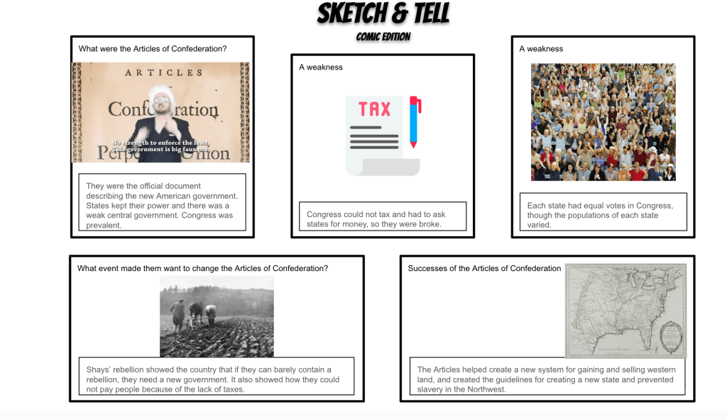 To end the day, students combined both pieces, their Frayer information and their cause and effect notes, into a Sketch and Tell Comic they created on the computer. They had to visually show what the Articles were, highlight a weakness, show what event made people want to change them, and show at least one success. You could see understanding in how they chose images, captions, and layouts. It also forces them to synthesize instead of copy.