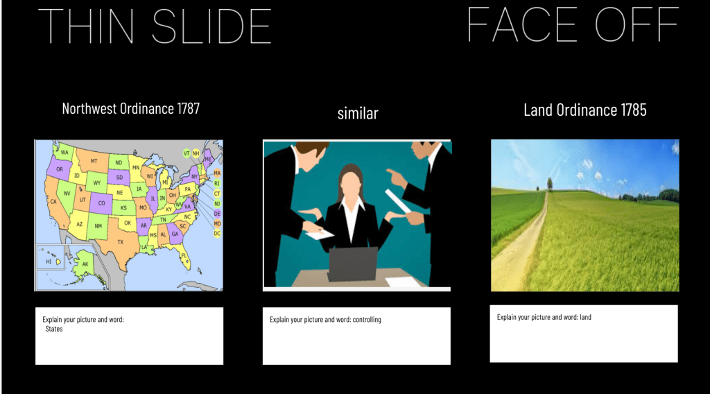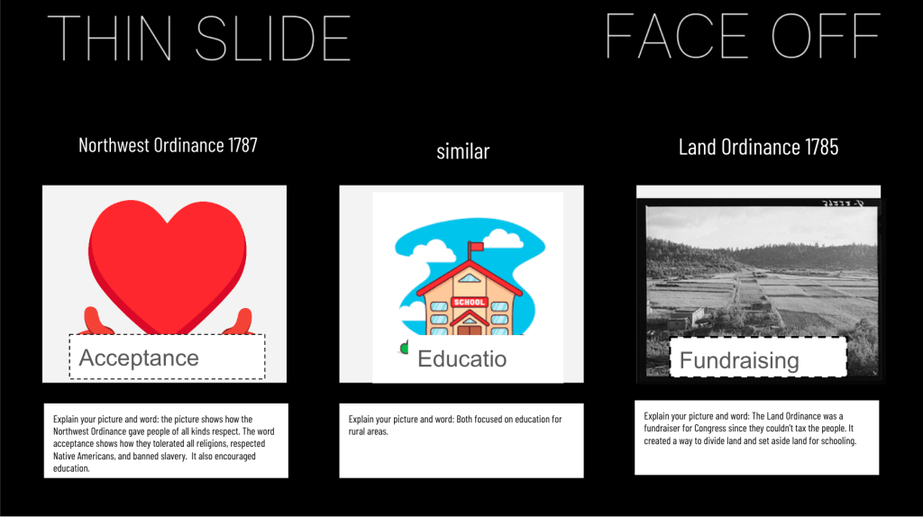 After the Number Mania, students completed a Thin Slide Faceoff comparing the Land Ordinance of 1785 and the Northwest Ordinance of 1787 and finding a similarity. One picture, one word, one explanation. Then partners combined their individual slides into one Thin Slide that showed similarities and differences.
