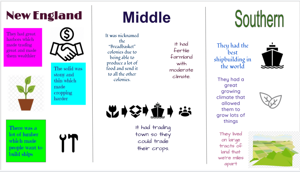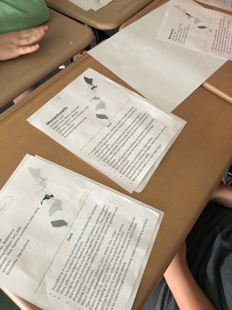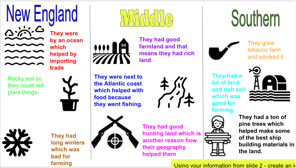 With a longer class period, Wednesday was a good day to start new content. We started with a Text Quest to learn about the impact of geography on the English colonies. (I’m not sharing the Text Quest because it’s a file from www.emc2learning.com).