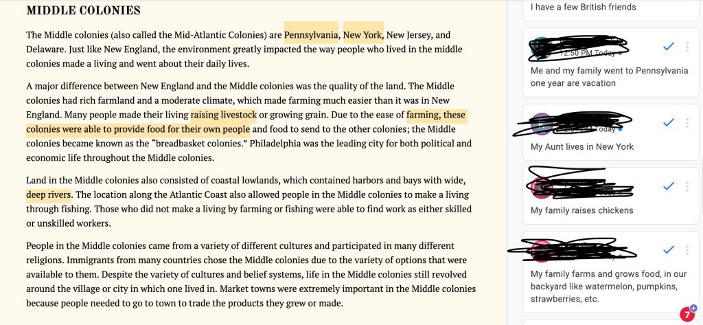 Today we moved into the Cyber Sandwich portion of the Text Quest. The article annotated by students the previous day was the same article today. I love to have students work with a text multiple times (even though they don’t realize it). However, today I broke the article into 3 sections (New England, Middle, and Southern) because it would be an easier load to handle. It worked out really well. Instead of a summary at the end of the Cyber Sandwich, I had students create an infographic comparing the geographies of the colonial regions.