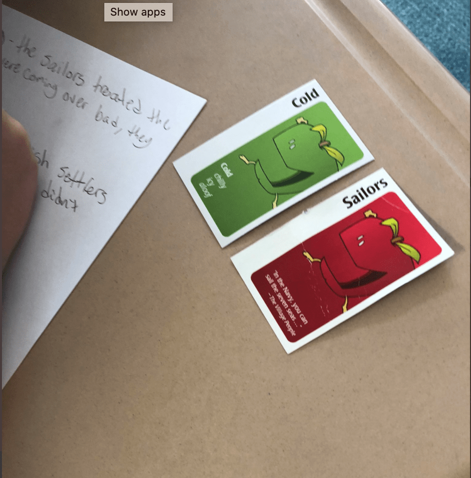 - Apples to Apples – draw 3 cards (nouns or adjectives) and relate/connect each card to something you learned.