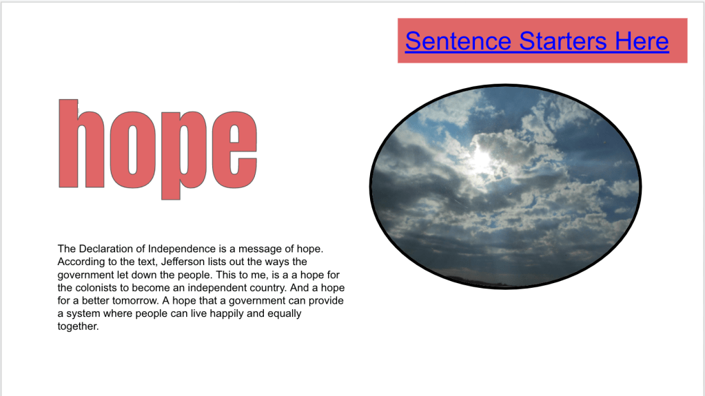 The last part of the lesson was a Thin Slide where I asked the question, “What does the Declaration of Independence mean to you?” Students had 4 minutes to create a slide with 1 picture and 1 word. After 4 minutes, students wrote a claim with evidence and reasoning to support their 1 word. They had to use their 1 word in the response. Students need a lot of help with writing claims so I provided some sentences starters for scaffolding. This Thin Slide was important because it set up our blackout poetry lesson for the Wednesday and Thursday.