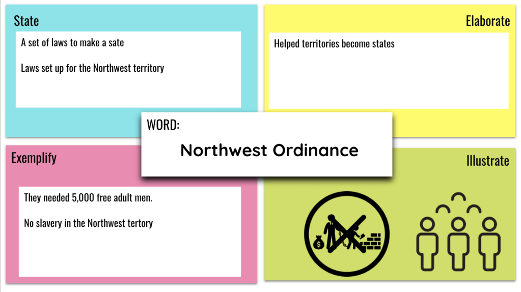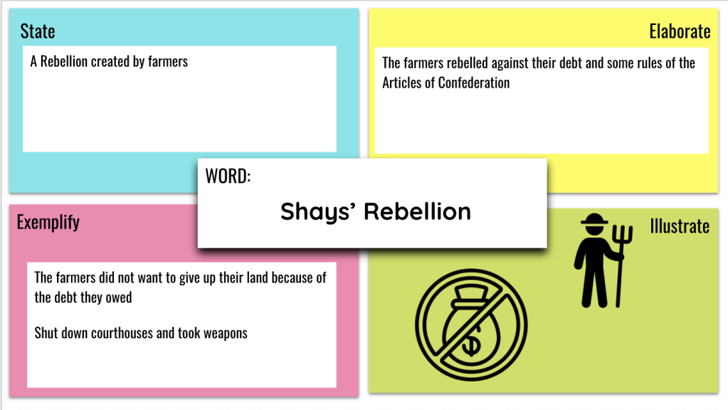 After students completed the Solo Iron Chef with the Articles of Confederation, Northwest Territory, and Shays’ Rebellion, I wanted them to create their own definitions on the Frayer. I asked them, “Based on what you learned, how would you define that word? How would you elaborate on that word? What examples or characteristics can you list?” If students can create their own definitions, this is learning at it’s finest. Did all students do it the correct way? No, and that’s okay. Here are some examples that students came up with after their learning: