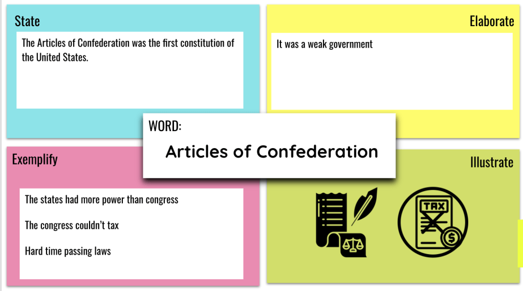 This week was a weird week with different schedules, and a day of remote learning. Nevertheless, we focused on some vocabulary and the Articles of Confederation.