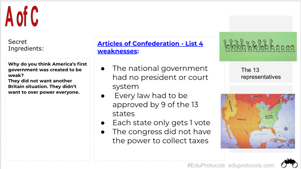 - Articles of Confederation – read the linked reading (or listen to it – I always record audio of me reading), list 4 weaknesses, add 2 pictures, create a title, and answer the secret ingredient question, “Why do you think America’s first government was created to be weak?”