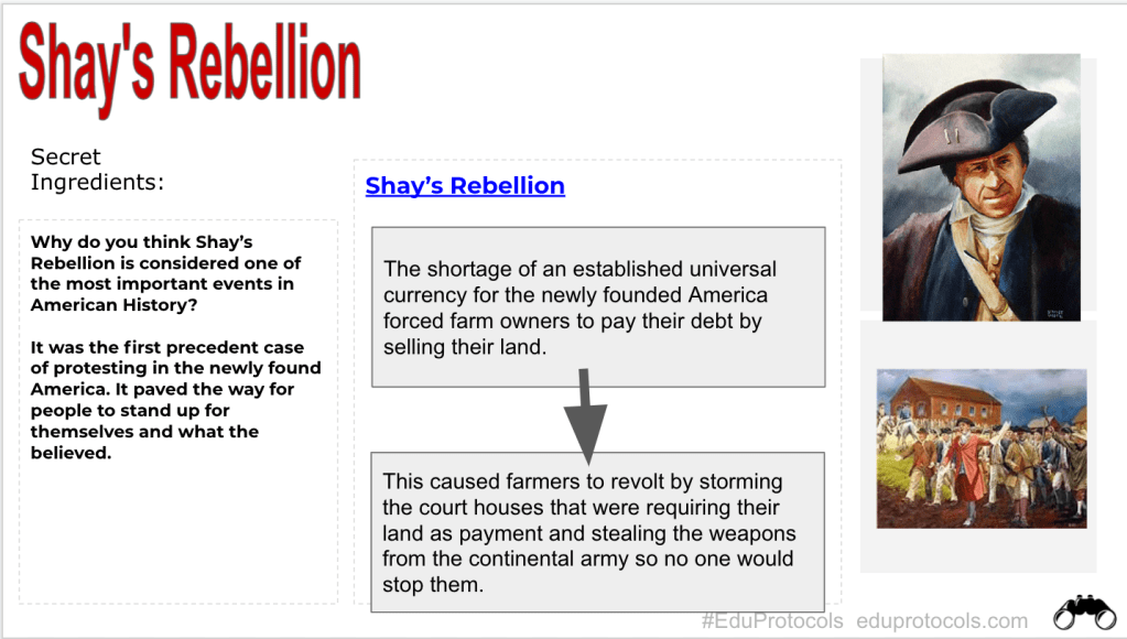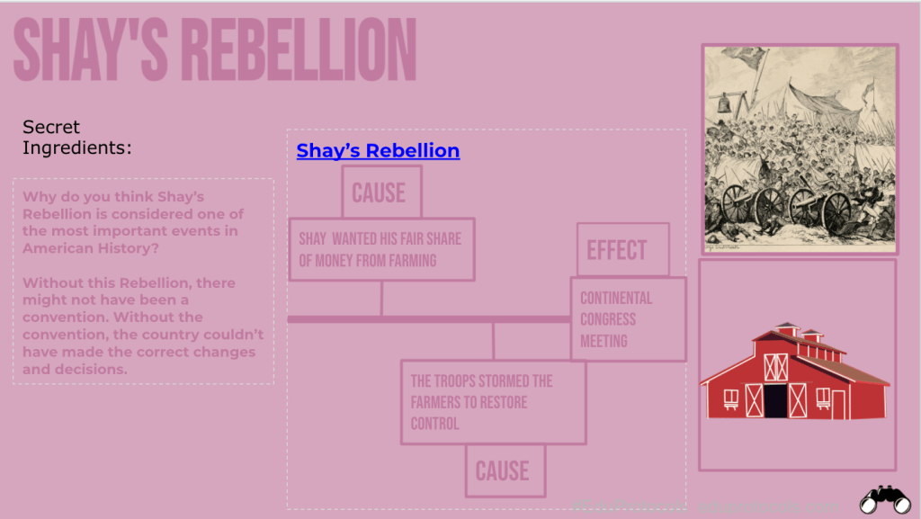 - Shays’ Rebellion – read the linked reading, create a cause and effect for Shays’ Rebellion, add 2 pictures, create a title, and answer the secret ingredient question – “Why do you think Shay’s Rebellion is considered one of the most important events in American History?”