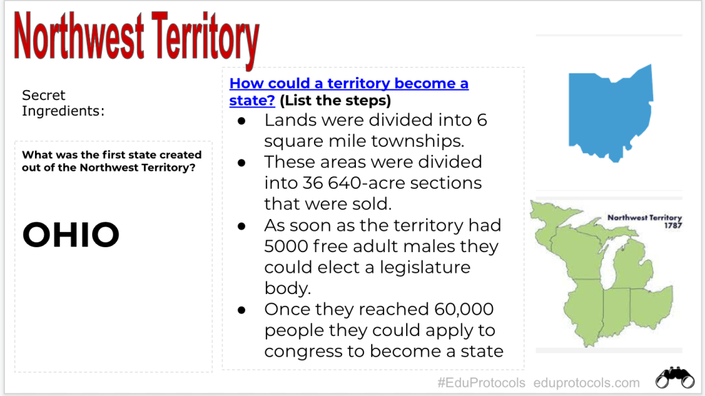 - Northwest Territory/Ordinance – read the linked reading, list out – How did a territory become a state?, add 2 pictures, create a title, answer the secret ingredient – “What was the first state created out of the Northwest Territory?”