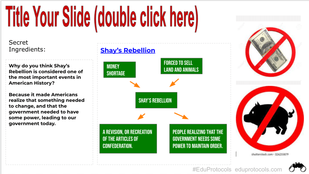 The Solo Iron Chef contains 3 slides with 3 different links. I took sections out of their textbook and linked in readings related to The Articles of Confederation, The Northwest Territory, and Shays’ Rebellion. For remote learning, I wanted students to only design and complete the Articles of Confederation slide.