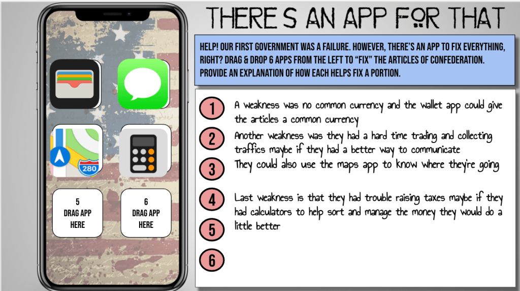 - There’s An App For That – created by Mike Meehan (@mrmeehanhistory) – choose 6 apps that would help fix the Articles of Confederation.