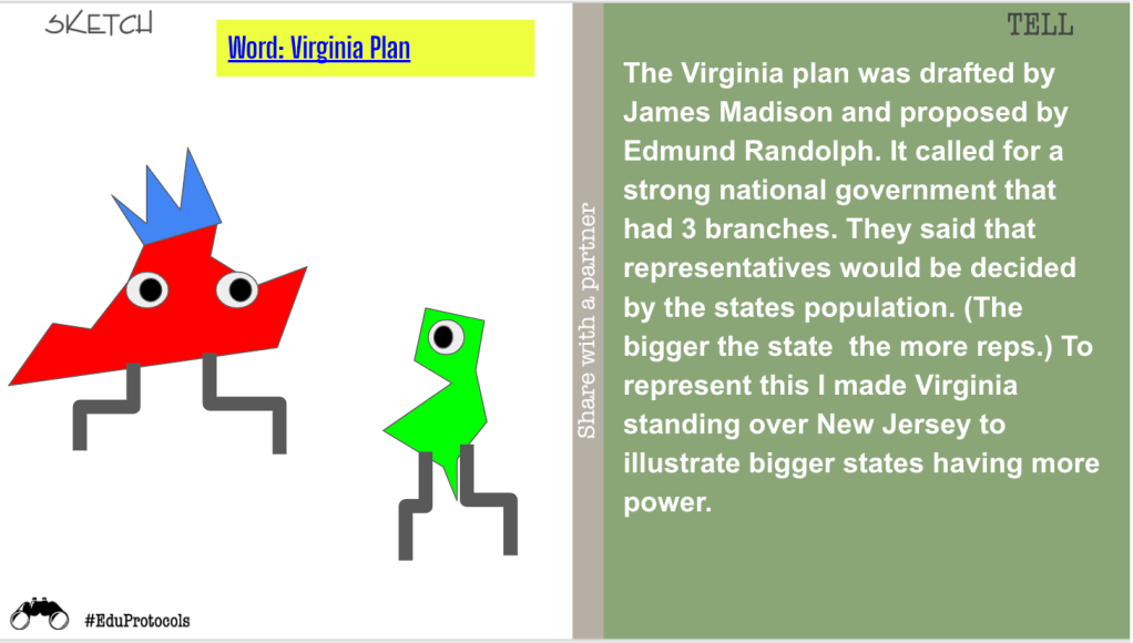 After the quiz was completed, we moved onto the Sketch and Tell where I asked students to create representations and explain the Virginia Plan, New Jersey Plan, and Great Compromise. I chose to do this because students have a hard time understanding these abstract ideas and sayings about representation, Houses, two bodies, Senate, etc. The Sketch and Tell is a perfect way for students to create abstract representations with a more concrete explanation of concepts.