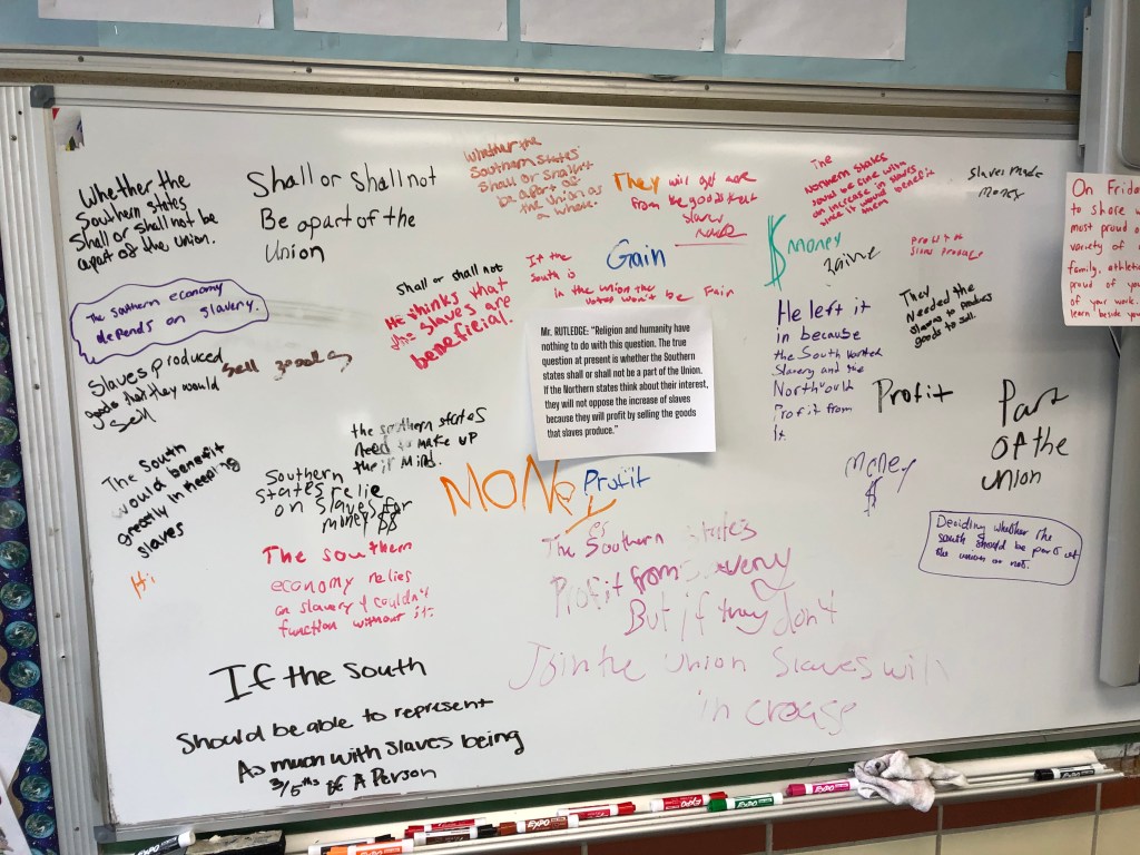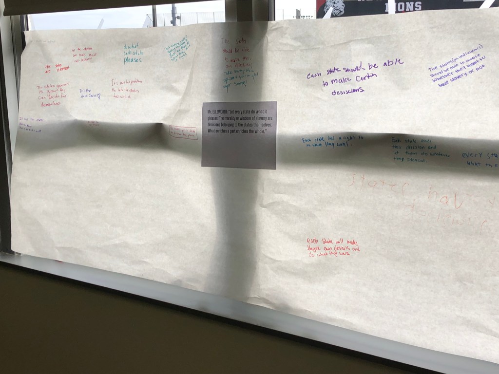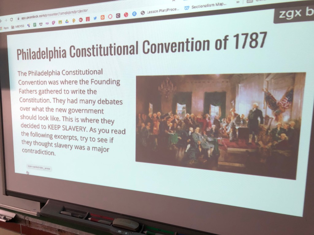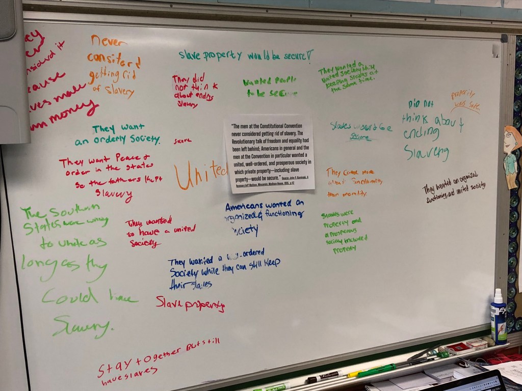 The next part of our lesson was a SHEG (Stanford History Education Group) lesson – Why did the Founding Fathers keep slavery in the Constitution. Students analyzed 3 quotes from the Convention, and 2 quotes from historians. Students analyzed these quotes through a graffiti wall that worked out very well! Then students answered the original question through a PearDeck lesson put together by Stacy Yung (@stacyyung). This was a great addition to our lesson from Friday.