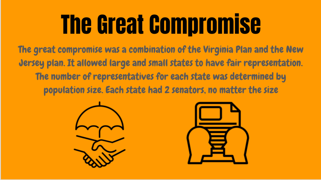 - With a partner (or by yourself) write and perform a dialogue (write a script) between two representatives at the conclusion of the Constitutional Convention. They should recall 5 major concepts as they discuss the Convention as a success or a failure. Turn in your script. (Use Google slides, docs) (question and connection)