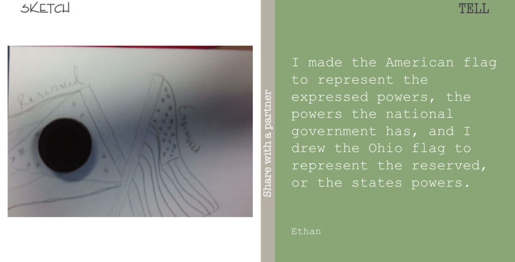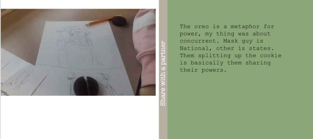 The next step in the lesson was having students show federalism with an Oreo. When I ask students to do this they look at me like I have 5 heads. I don’t show an example and let them think for a little bit. When I show another student example too early, they all want to do the same thing. I share a sketch and tell template with the students and let them create. Here is an example. Here are some samples: