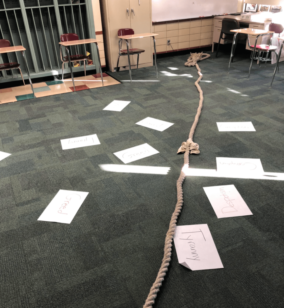 When students walked in 505 Thursday, the desks were cleared out of the way and I had a large tug of war rope running diagonally corner to corner. On the ground I had papers with the words, “Greed, Tyranny, Despotism, and Corruption,” written on them. Right away students are interested.