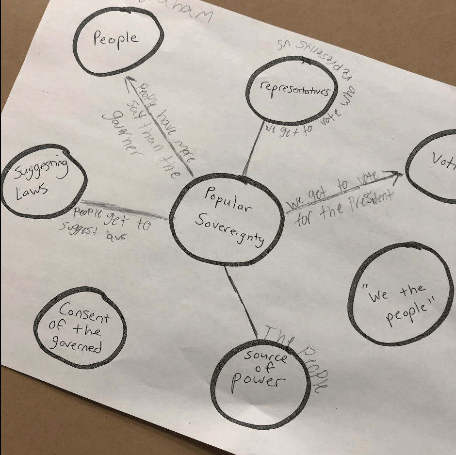 I wanted students working in small groups discussing the idea of popular sovereignty – even with no knowledge of the word. I found a piece of paper and wrote Popular Sovereignty in the middle. Around the word, I pulled out key phrases and words from the CyberSandwich article (I love this article because it hits on everything students should know about popular sovereignty). Students discussed and made connections with the main words and phrases from the article. This was to help build background knowledge before reading. Here is the CyberSandwich the students completed after the Keyword Predictor.