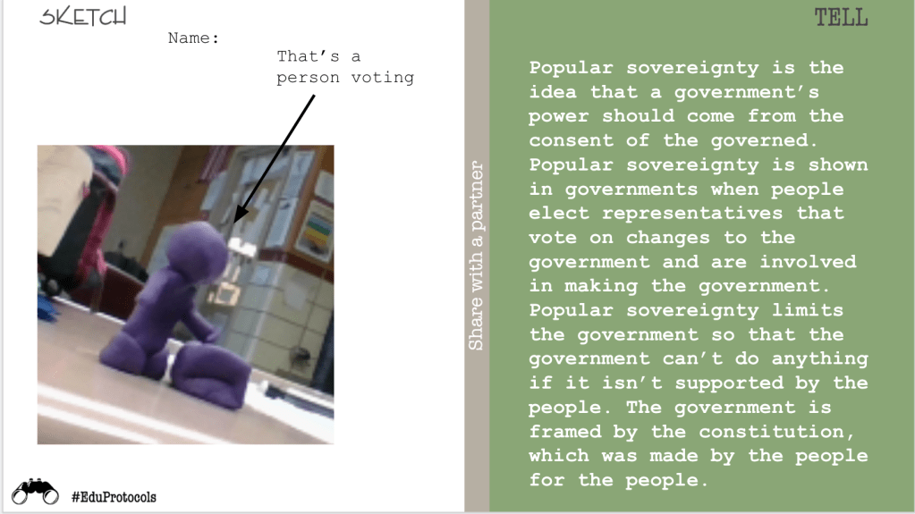 Sometimes it’s best to have students create rather than summarize. In the first example, I combined a Sketch and Tell with a Cyber Sandwich. Students created with Playdoh, Legos, or Google Shapes and wrote a summary.