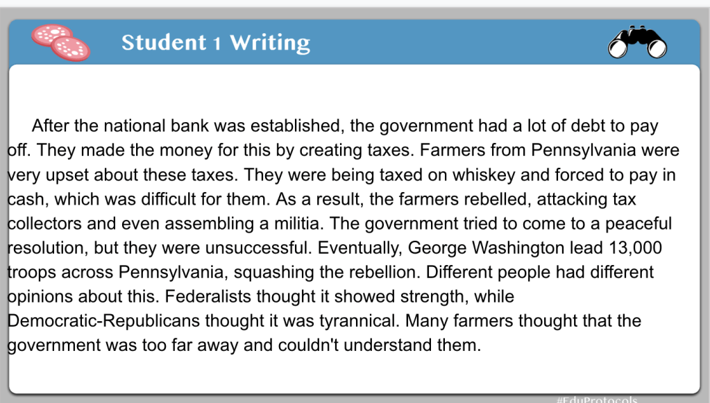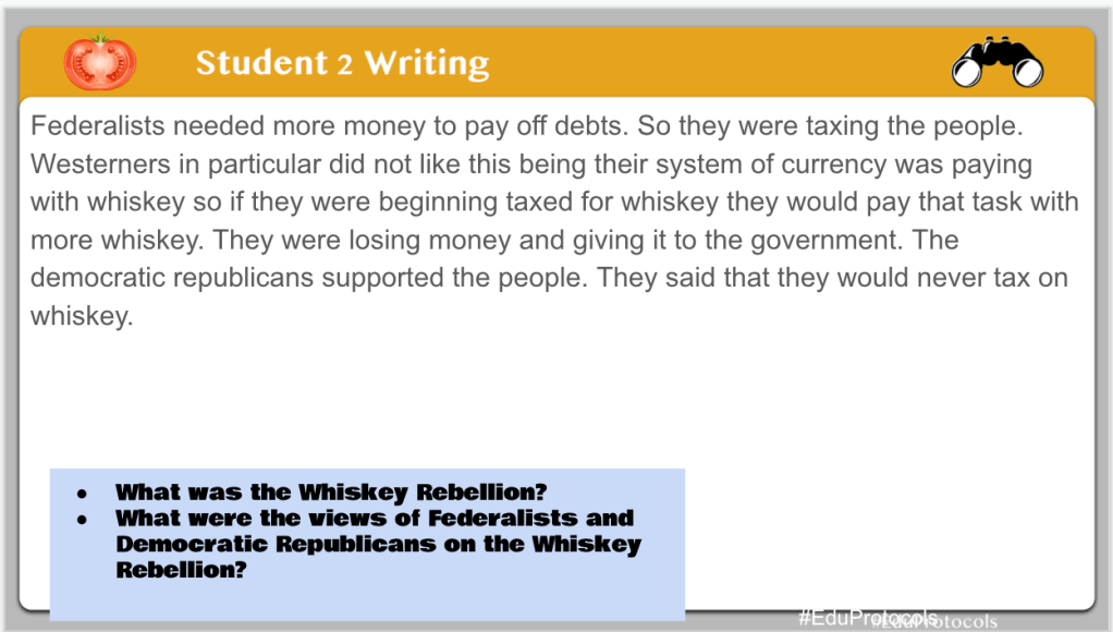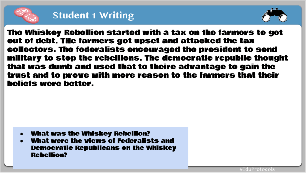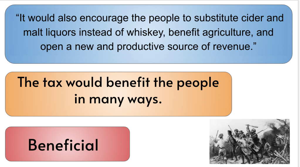 After the first rep of the Quizizz, I had students Frayer the word, “Excise Tax.” Taxes are things many 8th graders don’t fully understand. I felt this word was important to understanding the Whiskey Rebellion. Students used the SEE IT model for the Frayer – state the definition, elaborate on the definition, list 3 examples, illustrate, and talk about it. Here is an example of a completed Frayer…