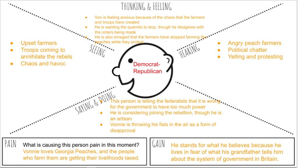 The ultimate goal of this quest through the Whiskey Rebellion is to have students analyze the rebellion through the eyes of a Federalist or Democratic-Republican. How would people from these parties feel about the taxes? How would they feel about the farmers rebelling? How would they feel about the use of military force to end the rebellion? The best way to do that is with an Empathy Map from Emc2Learning.