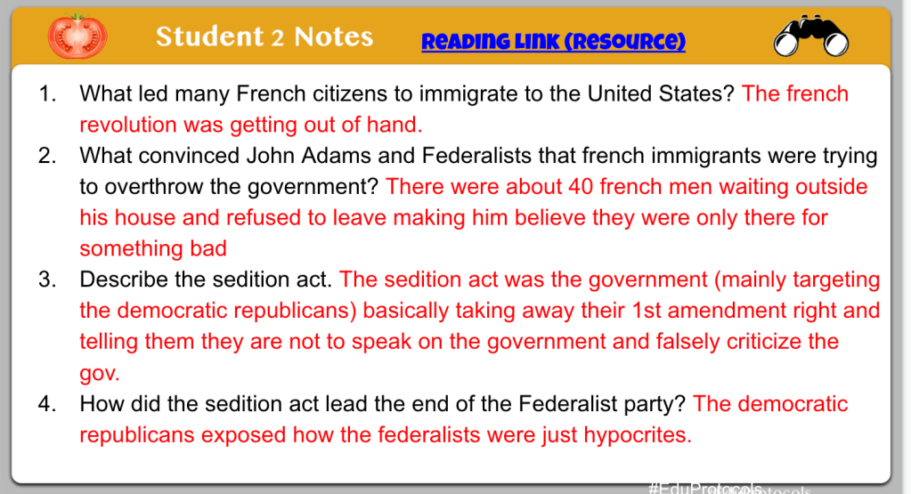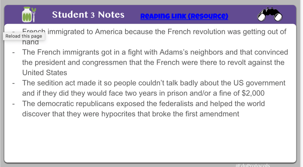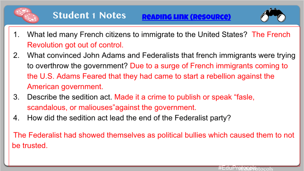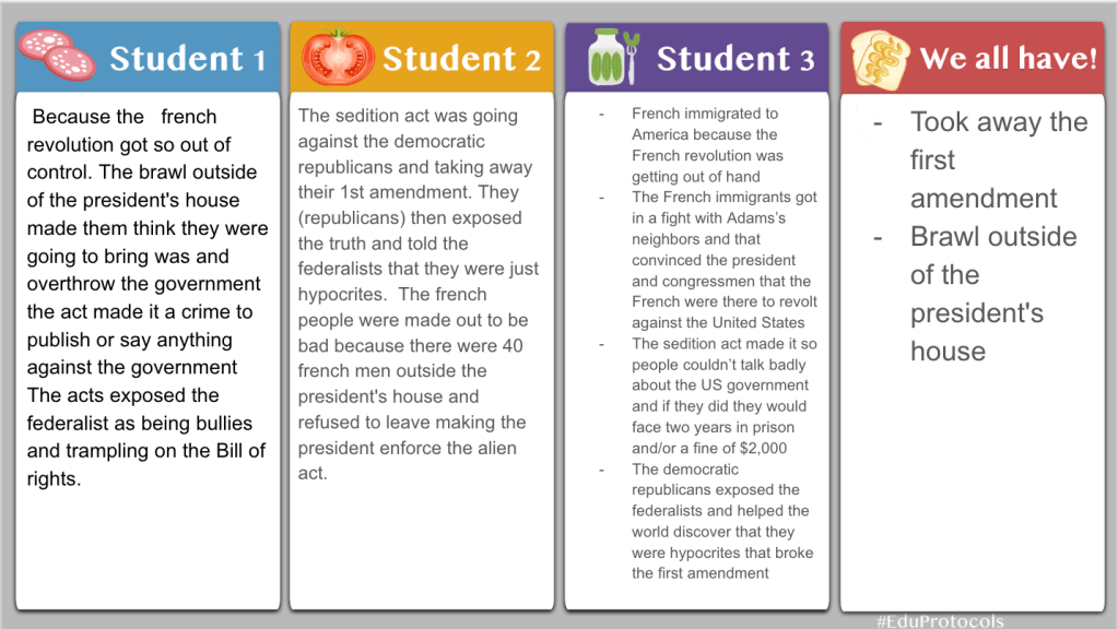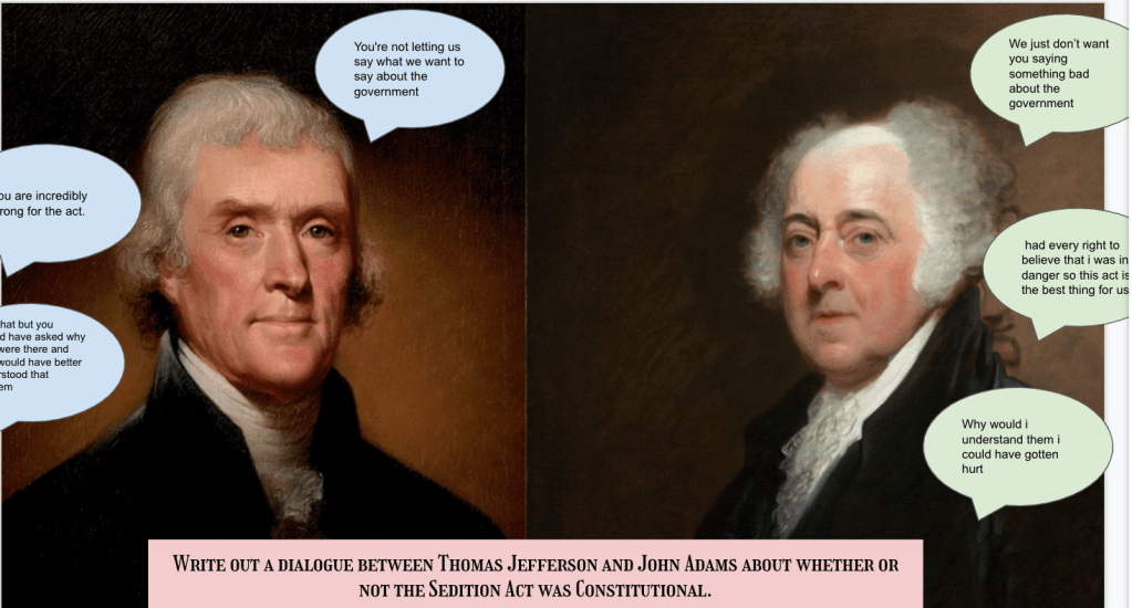 With this particular CyberSandwich, I added four questions to provide some scaffolding support for students. Instead of a summary at the end, I had students create dialogue between John Adams and Thomas Jefferson about the Sedition Act. I like to mix up the CyberSandwich from time to time to help with students engagement. However, the process stays the same – 10 minute, 5 minute discuss and compare, 10 minute summary or creation.