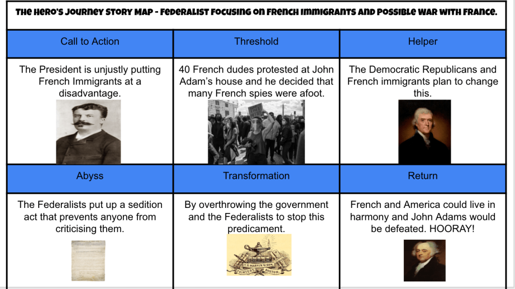 As I stated above – The main goal of each Quest is to learn about a decision made by each of the first five presidents. Then students analyze that decision from the perspective of a Federalist or Democratic-Republican. Tuesday, I wanted to have students fill out an empathy map from the perspective of a Federalist or Democratic-Republican regarding the Sedition Act. I decided not to do a digital copy and printed 100 empathy maps. By the time 5th period rolled around, I wanted to try out a new EduProtocol I learned from Dr. Scott Petri (@scottmpetri) called the Hero’s Journey. Scott likes to use this EduProtocol at the end of a lesson or unit. I wanted to use it in place of an Empathy Map – it had that same empathy map feel to it.