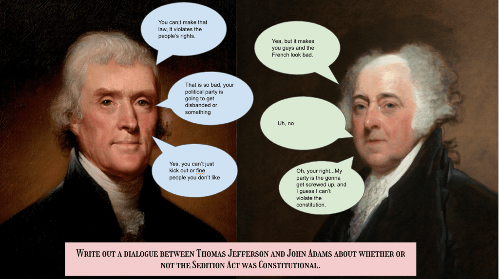 With remote learning last week, students studied John Adams and the Sedition Act. However, I only had 42% students engagement. When we came back from remote learning this past Monday, I needed something that could serve as an introduction to John Adams, yet serve as a continuation of student learning from remote. I couldn’t find much, so I typed up a one page article about the sedition act with background information and how both parties felt about the act. We also did some review this week with Blooket and Gimkit. I was hoping to get to Thomas Jefferson, but weather cut our plans short.
