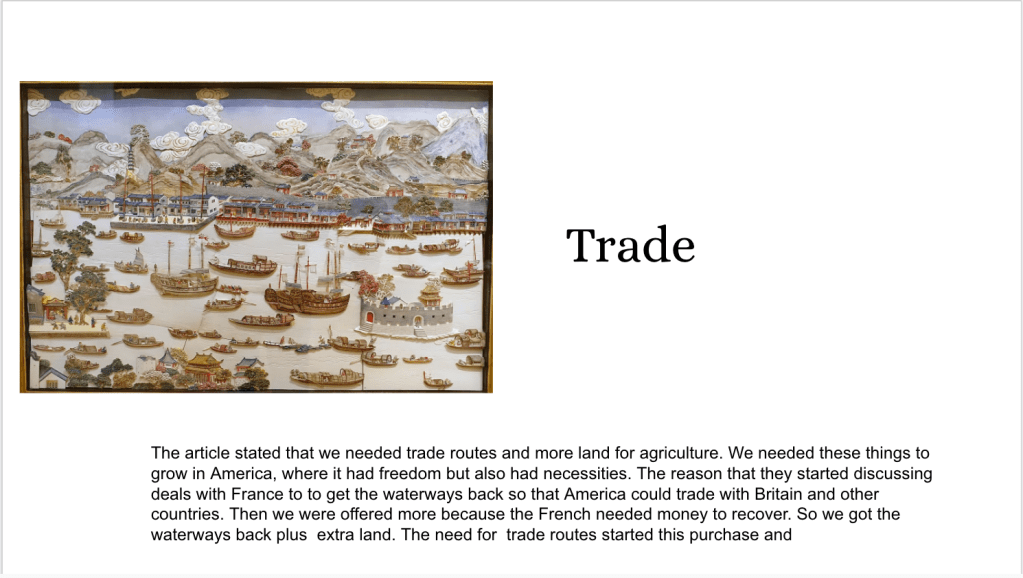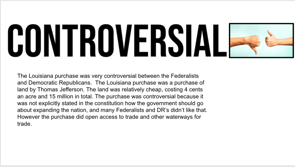 This week we continued the Early Republic Unit (I feel like this is a constant blog now). Between field trips, remote days, and snow – this 5-6 week unit is now moving into 7 weeks. Part of me want to end the unit now and move on, another part of me wants to finish it out and tinker with some new lessons. This week we lost Monday due to a field trip to a vocational school. Therefore, we had Tuesday, Wednesday, and Thursday for the Louisiana Purchase.
