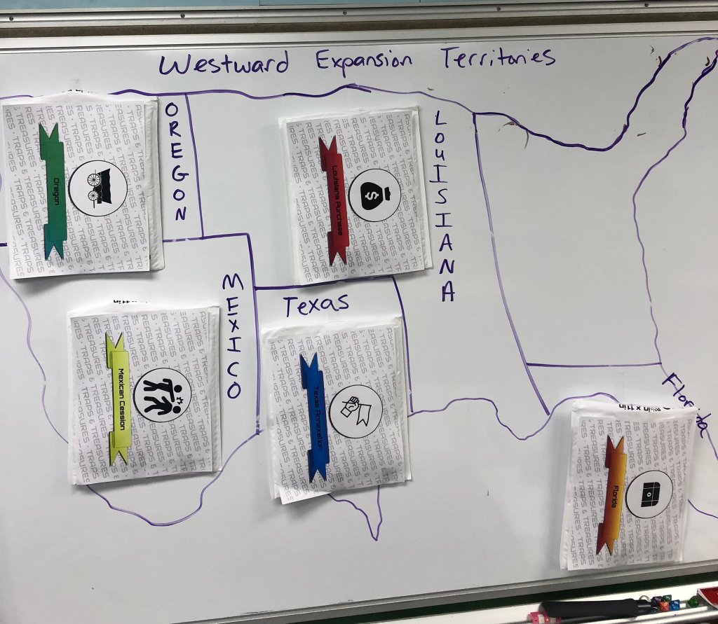When students came into the room, I had a map of the United States drawn on the whiteboard. Students got into their groups and got ready for the day. I took the readings from the Textbook and placed them in a large envelope. Then inside the large envelope was a smaller envelope which had a trap or treasure. The trap or treasure would give or take away points for each team. I also included some of the Power Up options into some of the envelopes. With each round, the points and power ups were changed to keep things interesting.