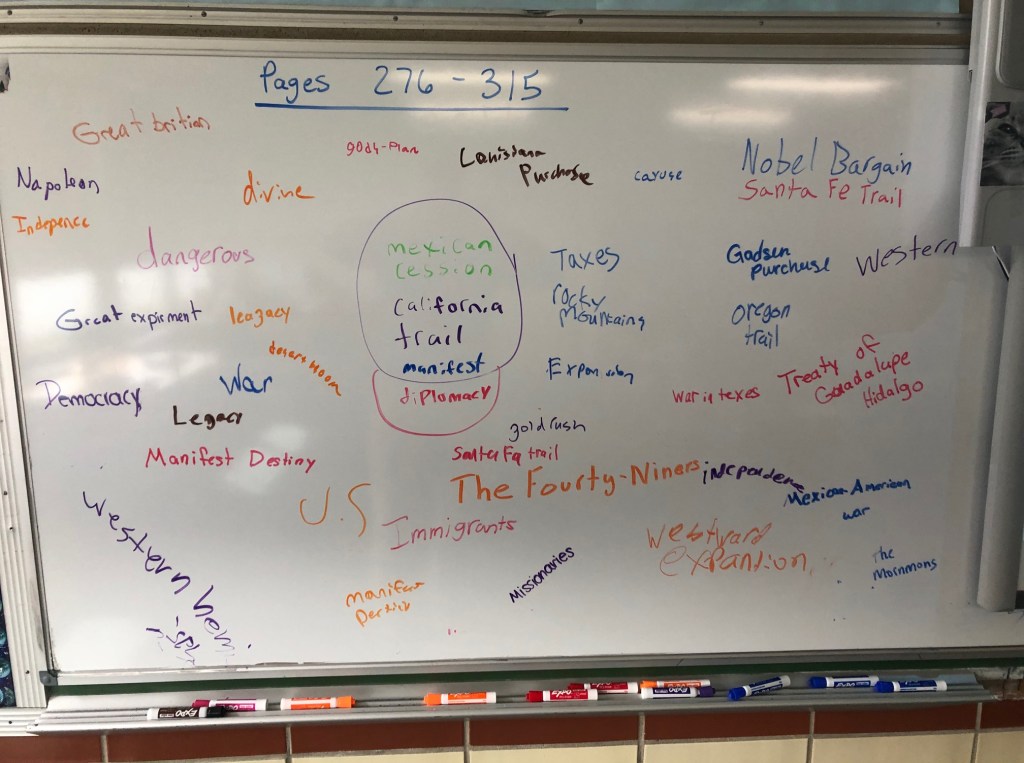 I instructed the students to look at pages 276-315 – skim and preview. I had them find words they thought were important to understanding Westward Expansion. If students found a word, they had to raise their hand and I had to call on them to go. There were 2 catches: