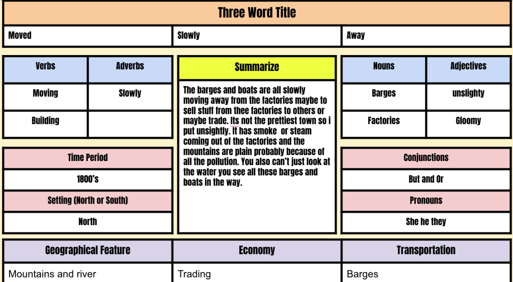 - Begin with an 8parts – I wanted the students to choose an image representing the North or the South. Students gave it a 3 word title, focused on nouns, adjectives, verbs, and adverbs. They would also list out an example of geography, economics, and transportation.Students finished the 8parts by writing a descriptive paragraph about the image.