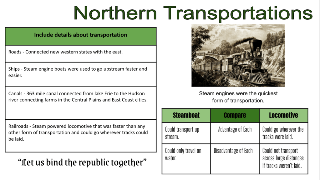 This year, I decided to focus on the differences in North and South based on the Industrial Revolution. We focused on geography, economy, and transportation. I wanted to go this route because it provided context and would eventually set us up for the Civil War unit afterwards.