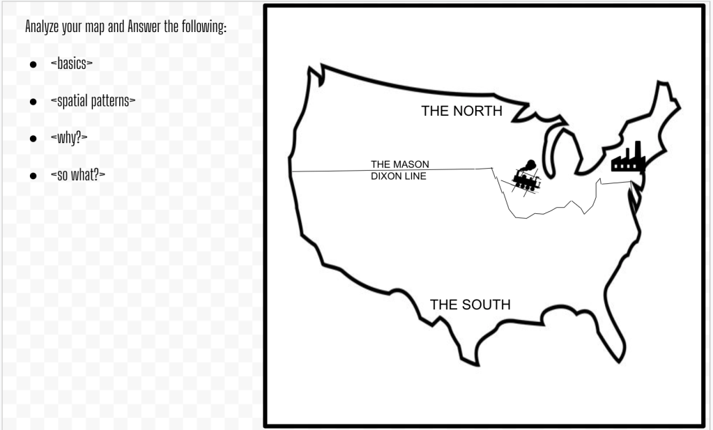 The end goal of the unit for students is having them understand how the Industrial Revolution impacted northern and southern states differently. The end assessment is an annotated map where students create symbols highlighting the differences and analyzing their maps.