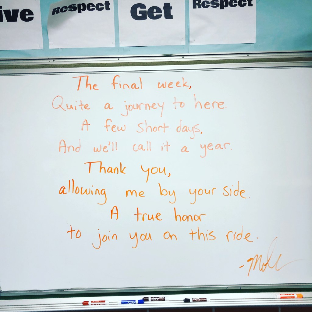Students often love the daily messages I write on the board. I don’t bring attention to them. I simply write them and let the students read them on their own. Occasionally, I will leave the board blank to see their reaction. A blank board is often met with disdain and a lot of questions. Here are my messages from the last week of school: