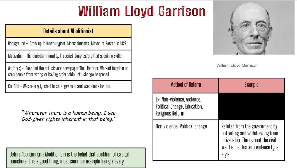 - Abolitionists – students created this Thick Slide, changed the share settings, and shared their slide with other classmates through a Google Form. I gave students a Frayer model and they used each other’s slides to learn about other abolitionists.