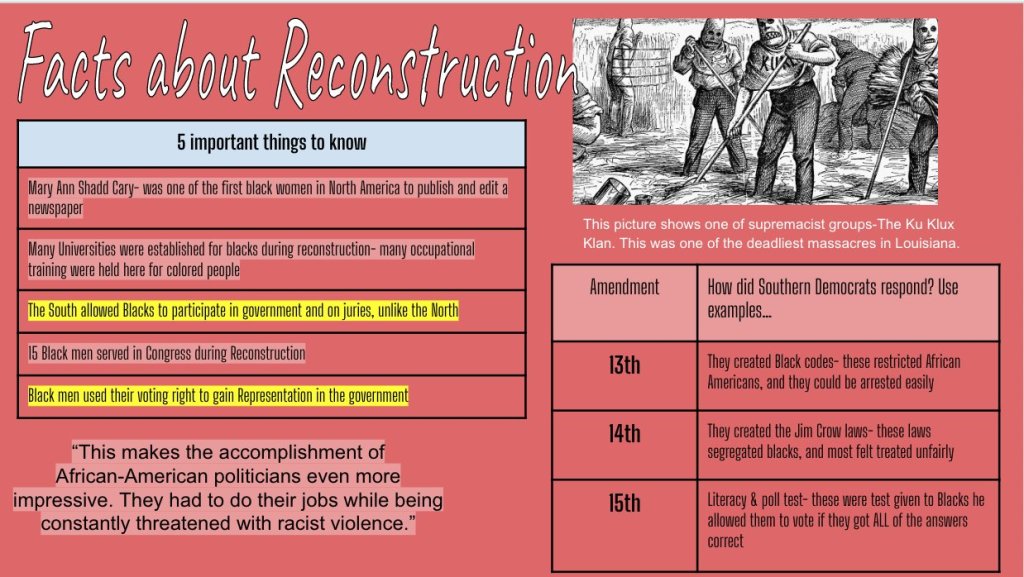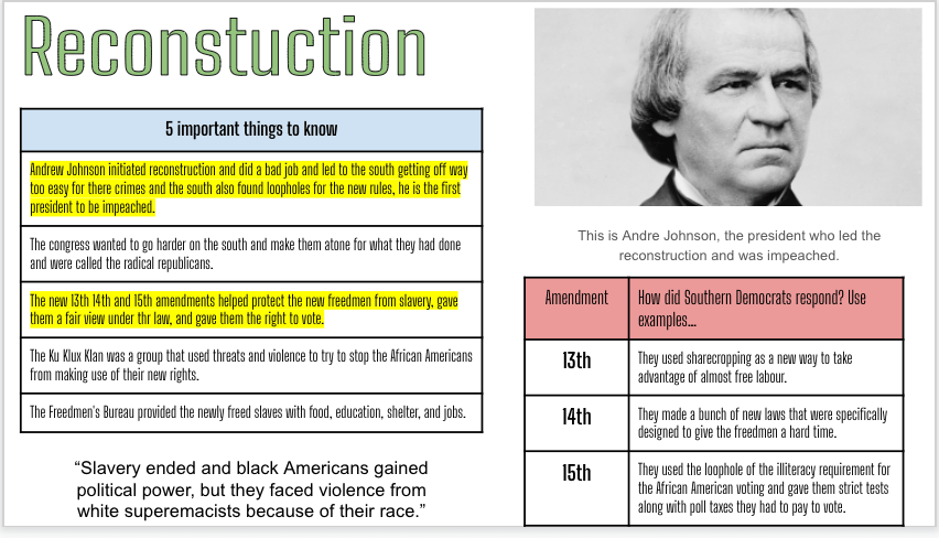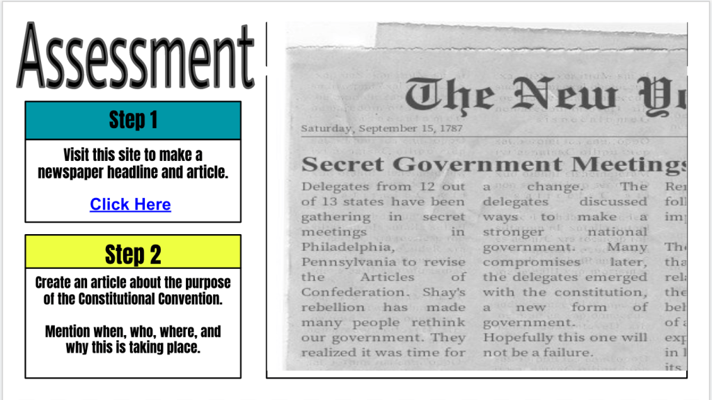 - Reconstruction – students used this Thick Slide to collect information. I had them give each other feedback about their slides. Then I had students reflect on which information was important versus not important. They used this to help them create a news story about Reconstruction.