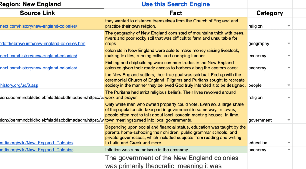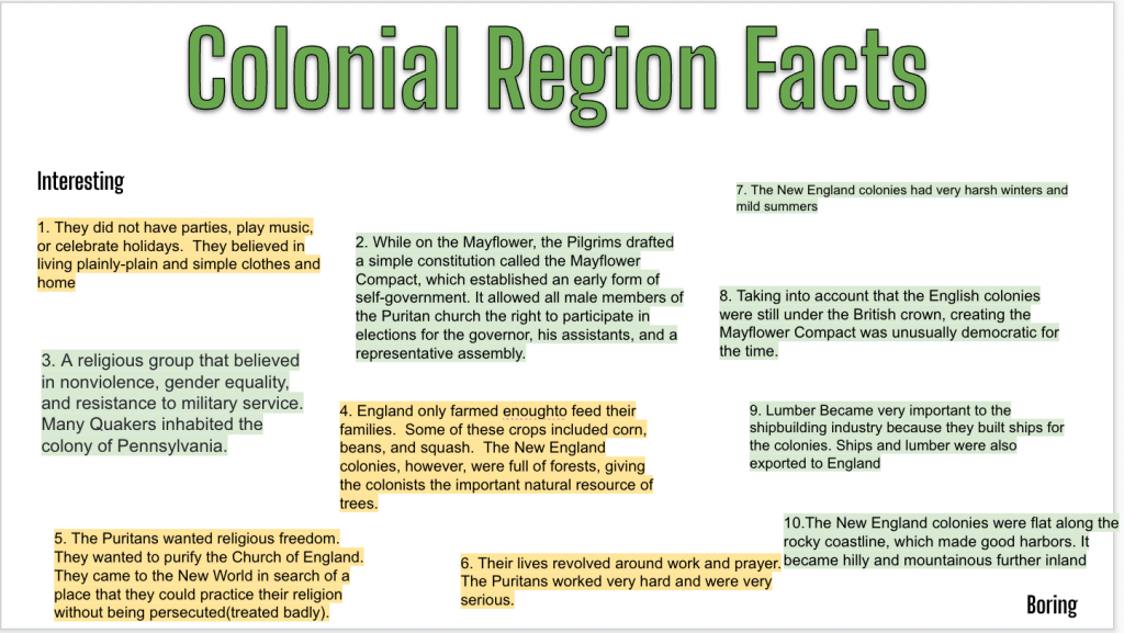 When students arrived, I had them choose one of the colonial regions. I gave them 30 minutes to find 15 or more facts from 3 different sources. This , of course, was scaled down from Scott’s AP version. For 30 minutes, students copied and pasted facts. I liked that I added in the category column because it had the students reading their facts and pondering how they should categorize them.