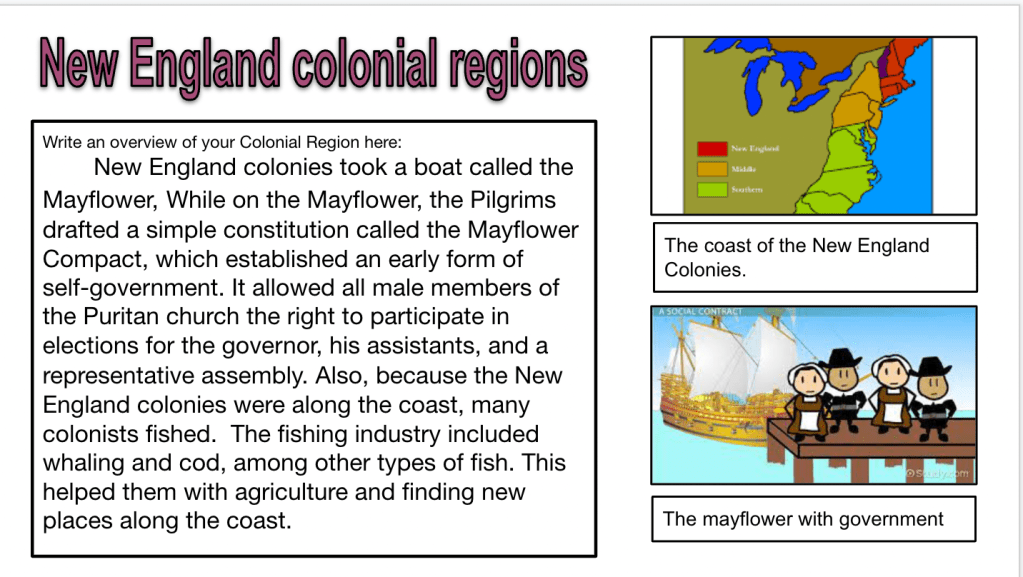 - Students read about the New England region and shared two facts on a collaboration board. (Students wrote down notes on a piece of paper.)