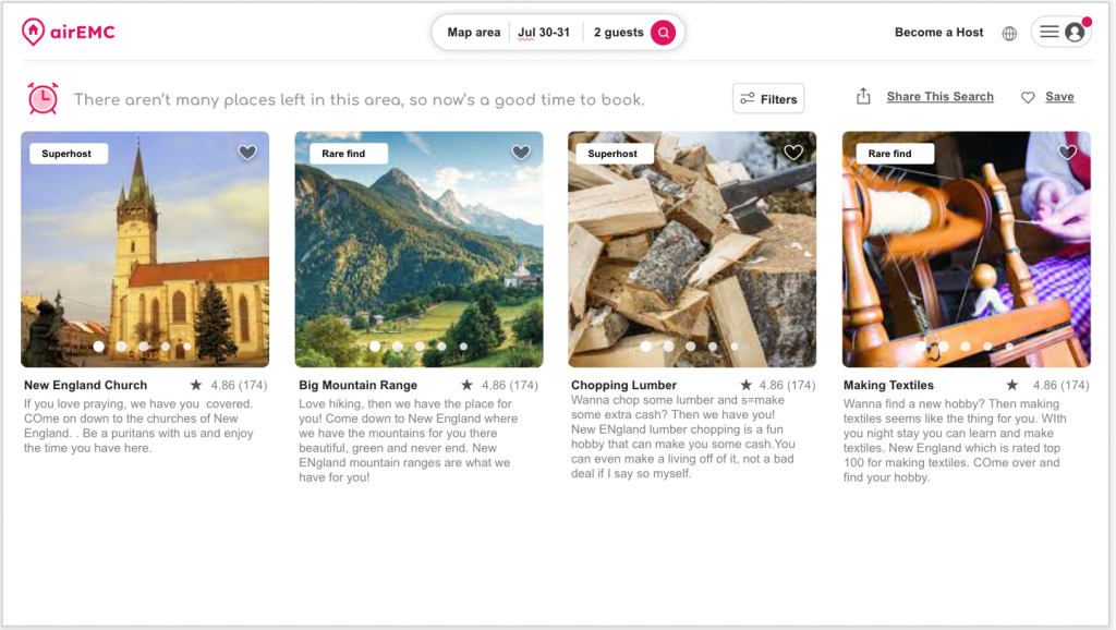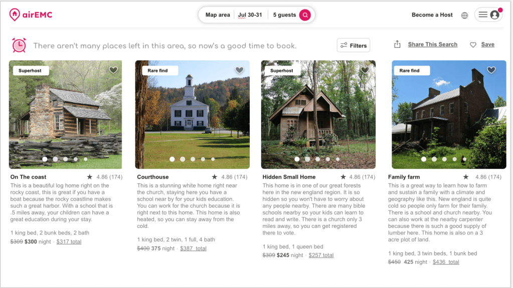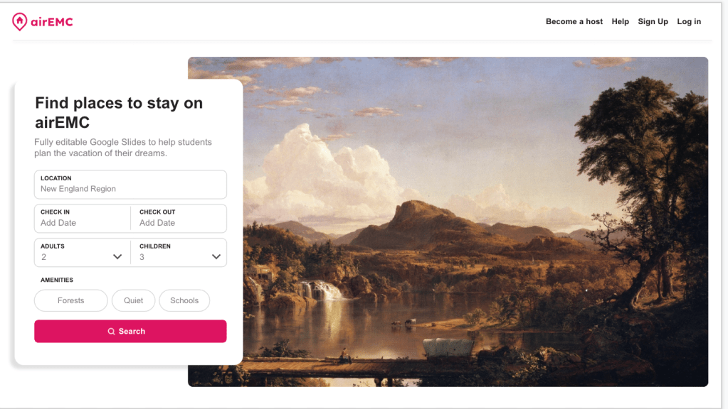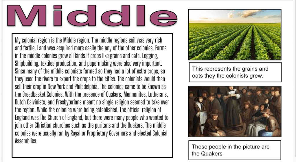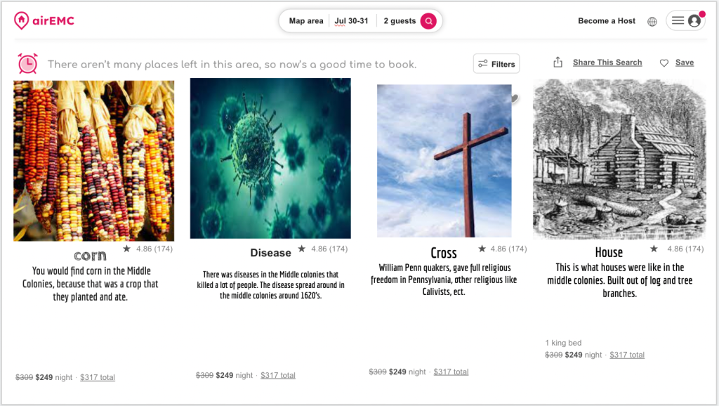 For the end product, I wanted to see what the students would create with the airEMC template (This is a template made to look like an airBnB site). The purpose was to convince people to move to your colonial region. However, as students began working, I feel like the message got lost and I threw too much at them at once. I established success criteria, but many students seemed lost. It may have been the original language on the slides of choosing a “home” or it could have been that they were not familiar with airBnB. Here are some examples: