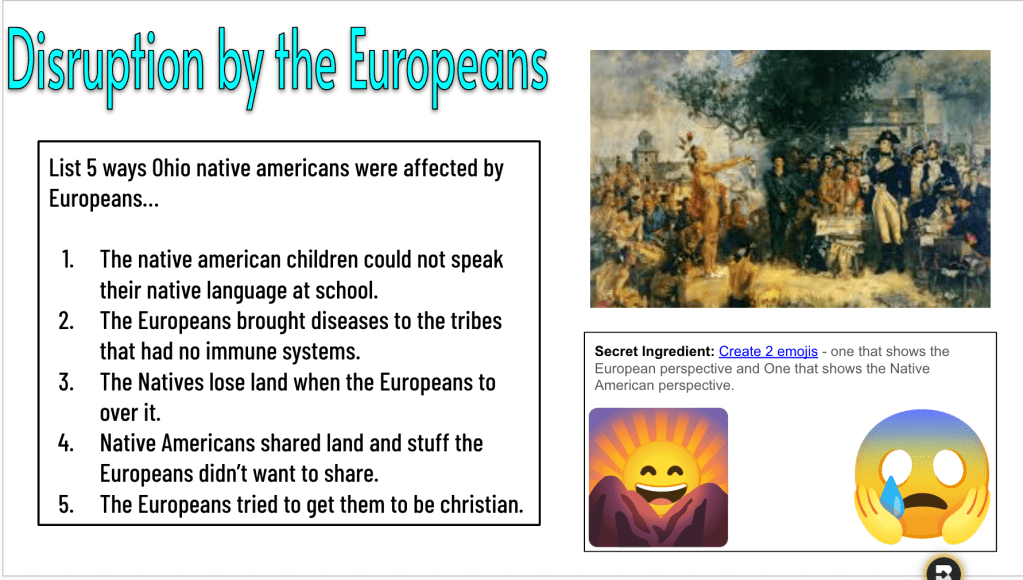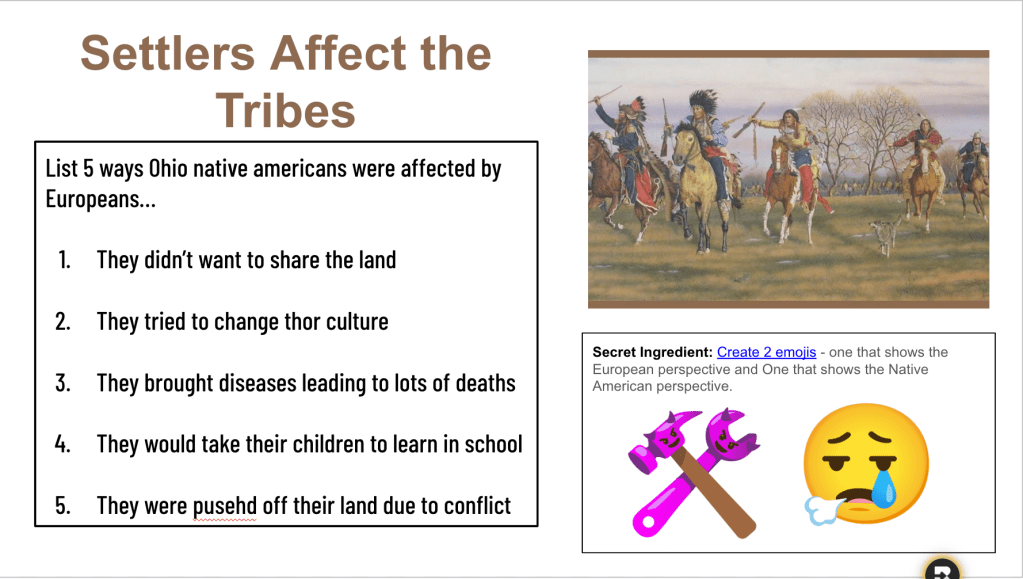 We concluded with the Emoji Kitchen concept, where students combined emojis to represent how Native Americans adapted to Ohio’s environment. This creative element allowed students to synthesize their learning visually, appealing to different learning styles and encouraging out-of-the-box thinking.