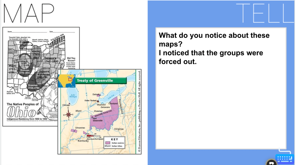 Next, we engaged in a Map and Tell exercise, comparing two maps: one showing Native American territories throughout Ohio, and another illustrating the effects of the Treaty of Greenville. This visual comparison helped students grasp the dramatic shift in Native American land holdings and the profound impact of settlement.