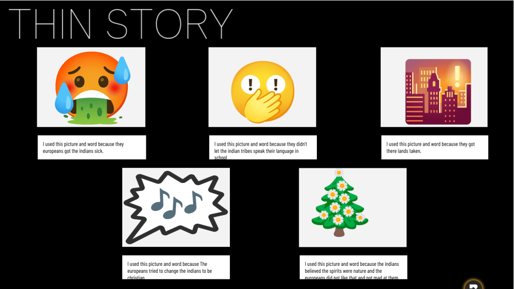 We concluded the lesson with a Thin Story activity. Students created a single image and word to represent how Native Americans were affected by Europeans, synthesizing all we had learned throughout the week.