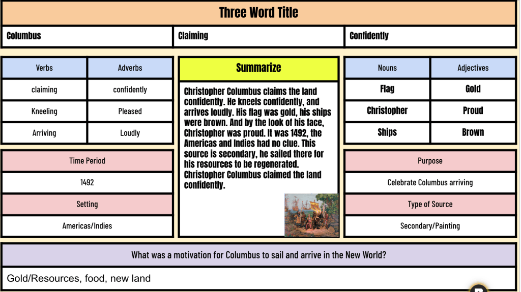 In Friday’s class, we started with an 8Parts activity using a painting depicting Columbus’s arrival in the Americas. Students are improving in their ability to break down images, and this activity took about 10 minutes. The goal was to tie the visual representation of Columbus’s arrival to Thursday’s lesson, where we analyzed whether Columbus should be considered a hero or villain. The 8Parts activity helped students focus on key aspects of the image, such as nouns, verbs, and adjectives that related to exploration, discovery, and interaction with indigenous peoples.
