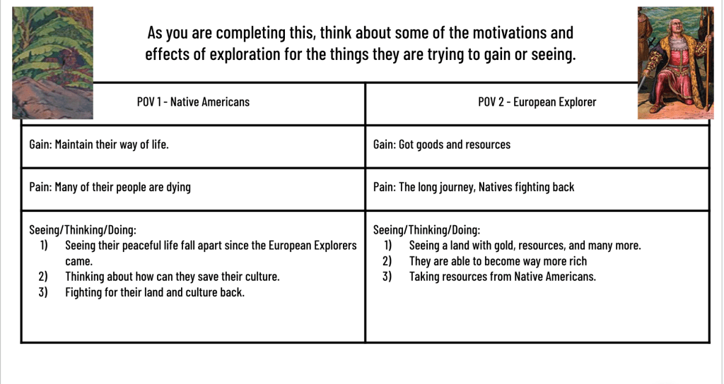Afterward, students completed a 2xPOV activity, where they considered the perspectives of both Native Americans and European explorers. I incorporated elements from an empathy map, asking students to think about what these groups might be feeling, seeing, doing, and gaining or losing. This helped students develop a more empathetic understanding of how exploration impacted both groups, while also drawing connections to the motivations and consequences discussed in the previous activities.