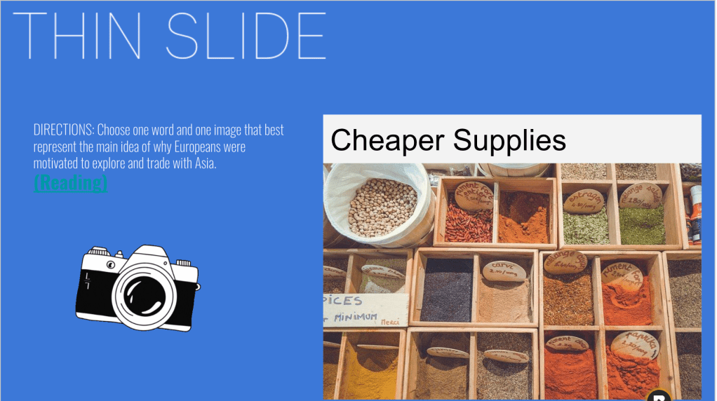 Thin Slide (3 minutes): We started with a quick Thin Slide activity where students selected a word and an image to represent a factor that motivated European exploration. The speed of this activity pushed students to think quickly and make instinctive connections between visual elements and key ideas, such as “spices” or “trade routes.” This set the tone for deeper exploration of the topic.