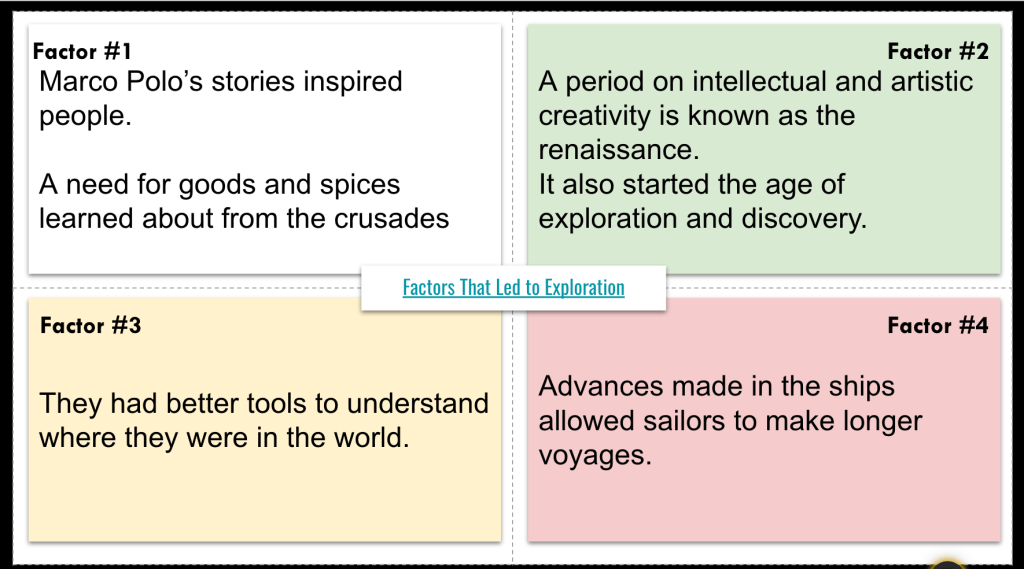 Frayer Model and Reading (20 minutes): After the Thin Slide, we shifted into a Frayer Model combined with a reading session. Students read about the key historical factors behind the exploration era—like Marco Polo’s influence, advancements in navigation, and the rise of trade. As they read, they filled out their Frayer Models, identifying four main factors (such as the Renaissance, the desire for wealth, better ships, and the spice trade). This process helped them structure their knowledge and highlight the key points in a logical manner. The Frayer Model worked especially well for students to internalize the information and make it more manageable.